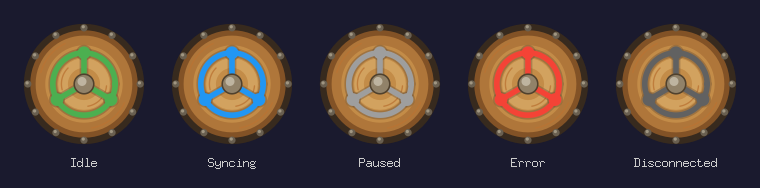 Redesign tray/app icon as a wooden round shield with iron rim, rivets, wood grain, and the Syncthing network motif (ring + 3 nodes + spokes) painted in the state color. Dark shadow outline for wood contrast. Inspired by Stammtisch hero icon style (warm, illustrated wood tones). - Dynamic tray icon changes color per state (green/blue/gray/red) - Static assets: PNG at 7 sizes + multi-size .ico + preview sheet - Icon generator utility (cmd/icongen) Co-Authored-By: Claude Opus 4.6 <noreply@anthropic.com>